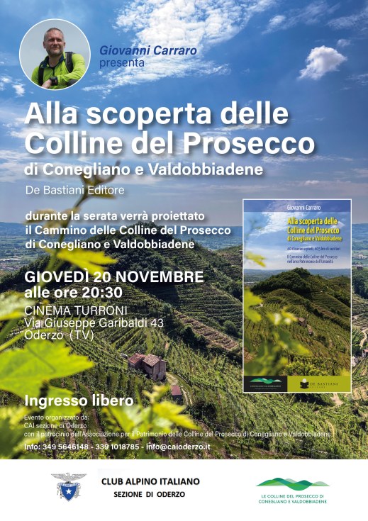 Eppure proprio in una città di pianura arriverà la prossima tappa del mio road show dedicato alle Colline del Prosecco di Conegliano e Valdobbiadene. È curioso, perché Oderzo sembra lontana da quei rilievi, ma in realtà la sua storia si fonde fin dall’epoca del “municipium opitergium” quando queste terre erano contese dai Da Camino e dai Collalto che ritroviamo ancora oggi nei racconti delle Colline UNESCO. È il CAI di Oderzo ad accogliermi con lo spirito che conosco bene fin da quando entrai tanti anni fa nel CAI di Conegliano agli inizi del mio percorso di ricerca tra le montagne. Il 20 novembre alle 20.30 al Cinema Turroni porterò il mio racconto delle Colline del Prosecco di Conegliano e Valdobbiadene con molte novità raccolte in questi ultimi mesi. Vi aspetto!