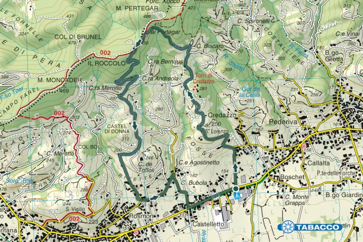 Dal ristorante Alla Bona lungo la SP32 imbocchiamo via Credazzo che sale tra vigneti e case di campagna fino a raggiungere la chiesa di San Lorenzo, dove è presente in un angolo del campanile una pietra incisa dall’aspetto enigmatico. La tradizione popolare racconta che chi la tocca sia indotto alla follia, da qui il nome di “Piera dei mat”, attribuito anche ad altre pietre simili sparse nel territorio circostante. Per alcuni sono riconducibili ad un antico linguaggio, molto più probabile la tesi che siano opera di qualche bontempone dell’epoca. Proseguiamo tenendoci a sinistra al bivio successivo e in breve raggiungiamo l’accesso all’area delle Torri di Credazzo che emergono sul colle sovrastante. Continuiamo lungo una ripida stradina cementata che più avanti si fa sentiero fino a località Pertegar, dove sorge una casera con archi immersa tra gli ulivi. A quota 430 metri, punto più alto del percorso, ci innestiamo per un breve tratto sul Cammino Unesco e poi giriamo a sinistra scendendo con alcuni tornanti verso Casa Merotto. Il rientro lo affrontiamo passando alla base del Castel di Donna e lungo le Rivette fino a Posmon dove incontriamo l’oratorio settecentesco di San Giuseppe accanto a Villa Canel, quindi percorriamo Via Crede e la ciclopedonale della SP32 fino al punto di partenza.