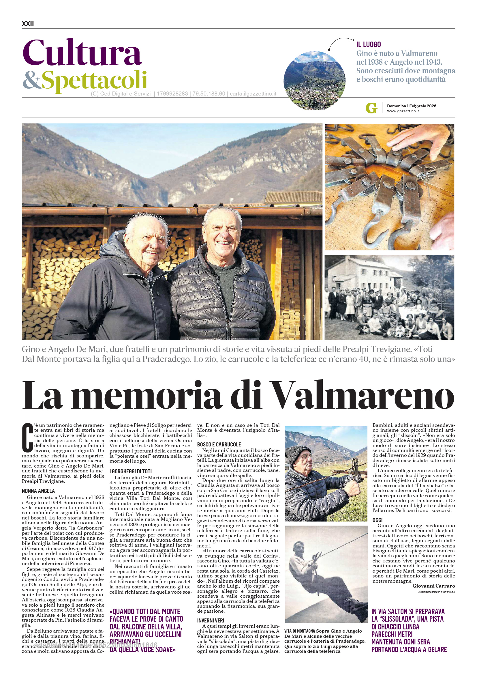 Ne avevo parlato, qualche giorno fa, di questi due vivaci fratelli di Valmareno. Gino e Angelo De Mari sono la storia della montagna in Corin e Praderadego, la nostra storia. Con loro i ricordi di Toti Dal Monte in portantina, dello zio Jijo Capia con la fisarmonica, delle corde a sbalzo, della nonna Angela, non andranno perduti. Per fortuna che li ho incontrati e li ringrazio con qualche riga, oggi nel Gazzettino di Treviso.