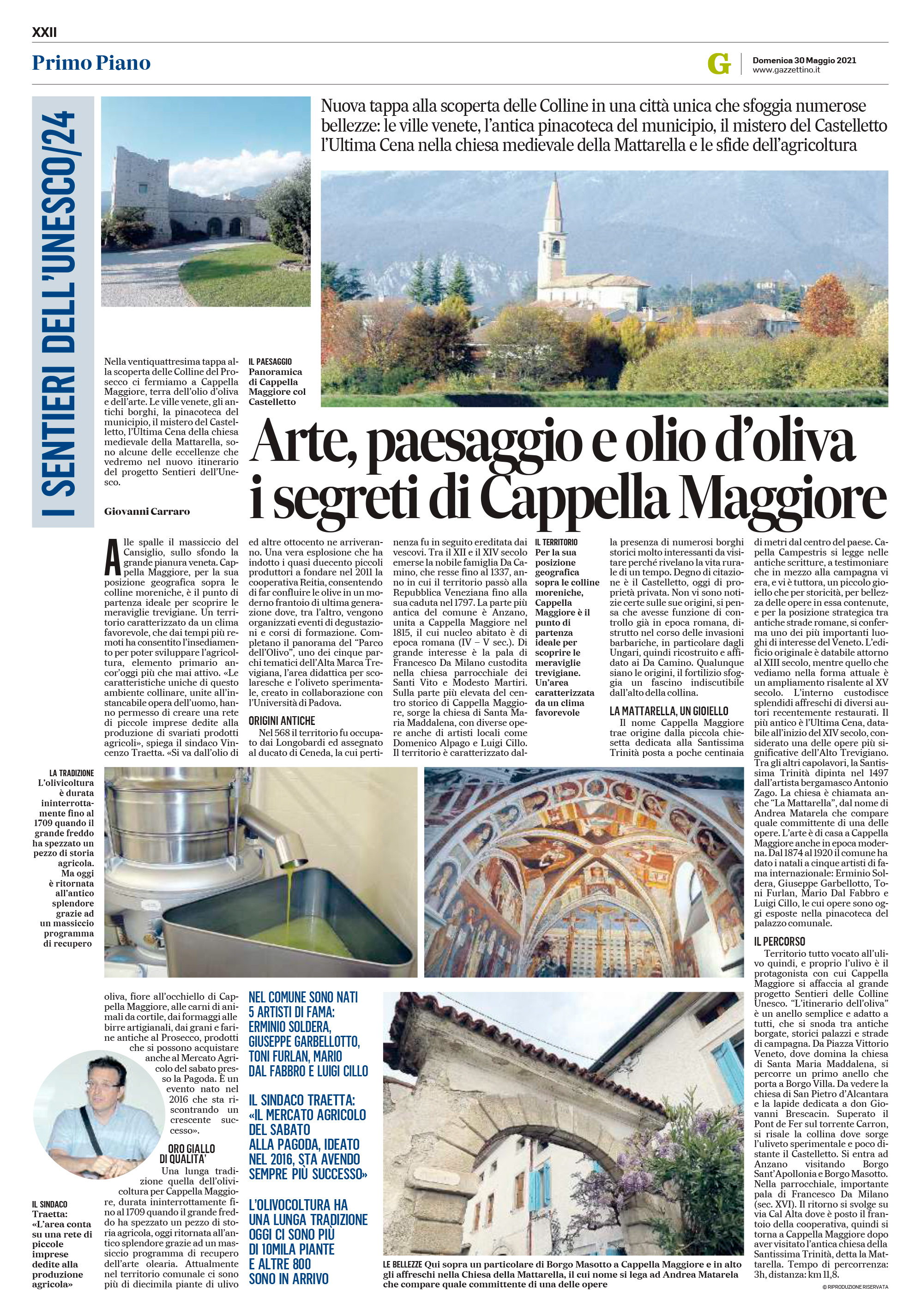 Nella ventiquattresima tappa alla scoperta delle Colline del Prosecco ci fermiamo a Cappella Maggiore, terra dell’olio d’oliva e dell’arte. Le ville venete, gli antichi borghi, la pinacoteca del municipio, il mistero del Castelletto, l’Ultima Cena della chiesa medievale della Mattarella, sono alcune delle eccellenze che vedremo nel nuovo itinerario del progetto Sentieri dell’Unesco