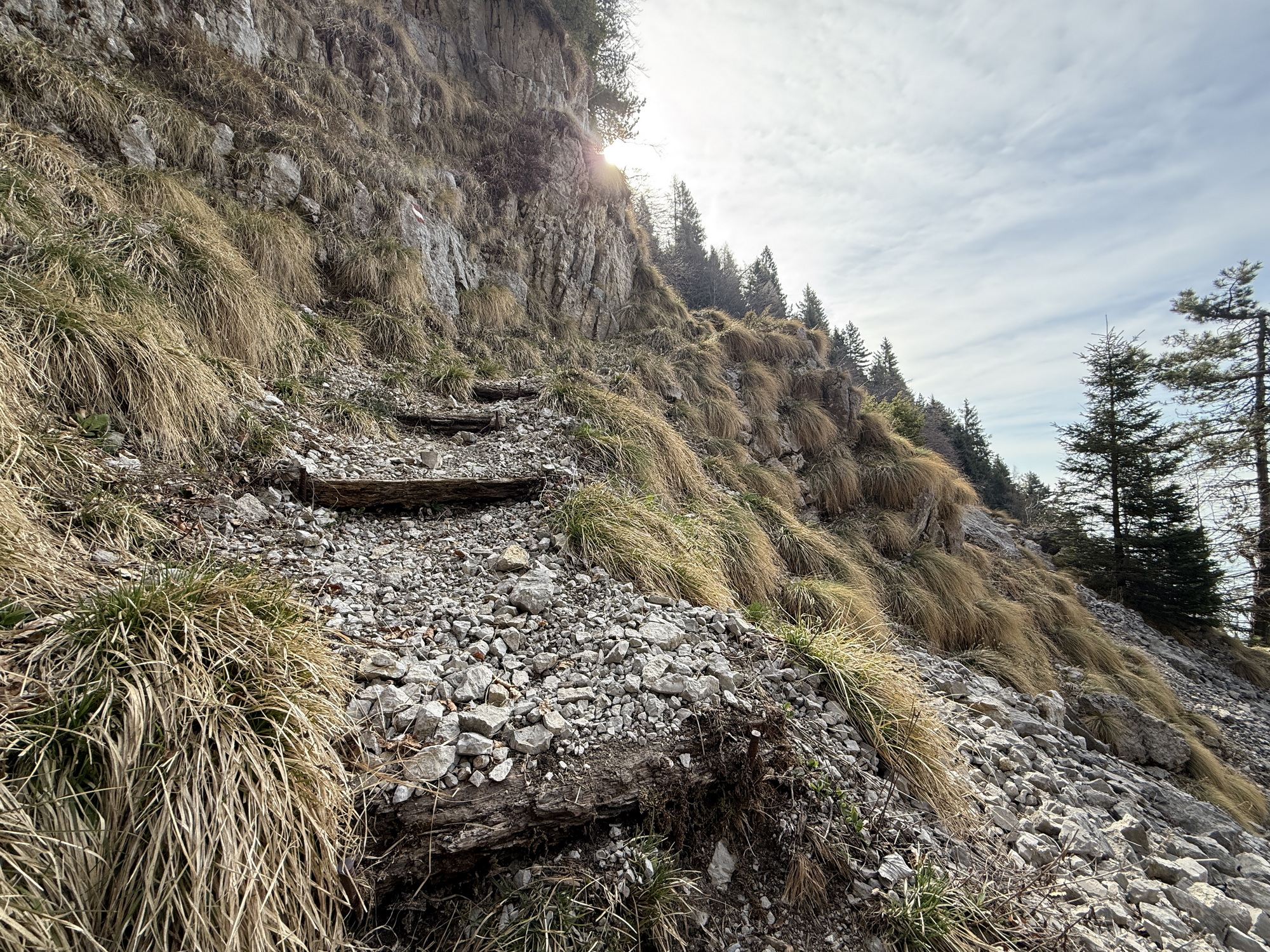 Partiamo a quota 600 m in località La Briglia di Sonego e seguiamo un tratto della “Direttissima” che sale molto ripido in direzione del Pizzoc. Dopo aver incontrato il capitello di Sant’Antonio da Buso e superato un breve tratto attrezzato con cordino fisso, raggiungiamo a quota 1150 m il Sentiero del Bracconiere n.981. Lo seguiamo verso destra attraversando alcuni passaggi leggermente esposti e incontrando Casera Mandre, posta in una radura panoramica. Giunti in località Cros, dove si trovano alcuni ruderi, scendiamo fino a intercettare la strada che conduce a Cadolten. Poco più a valle ci inseriamo sul Sentiero Terra Nera n.981A che, con lunghi tratti nel bosco, ci riporta alla Briglia chiudendo l’anello.