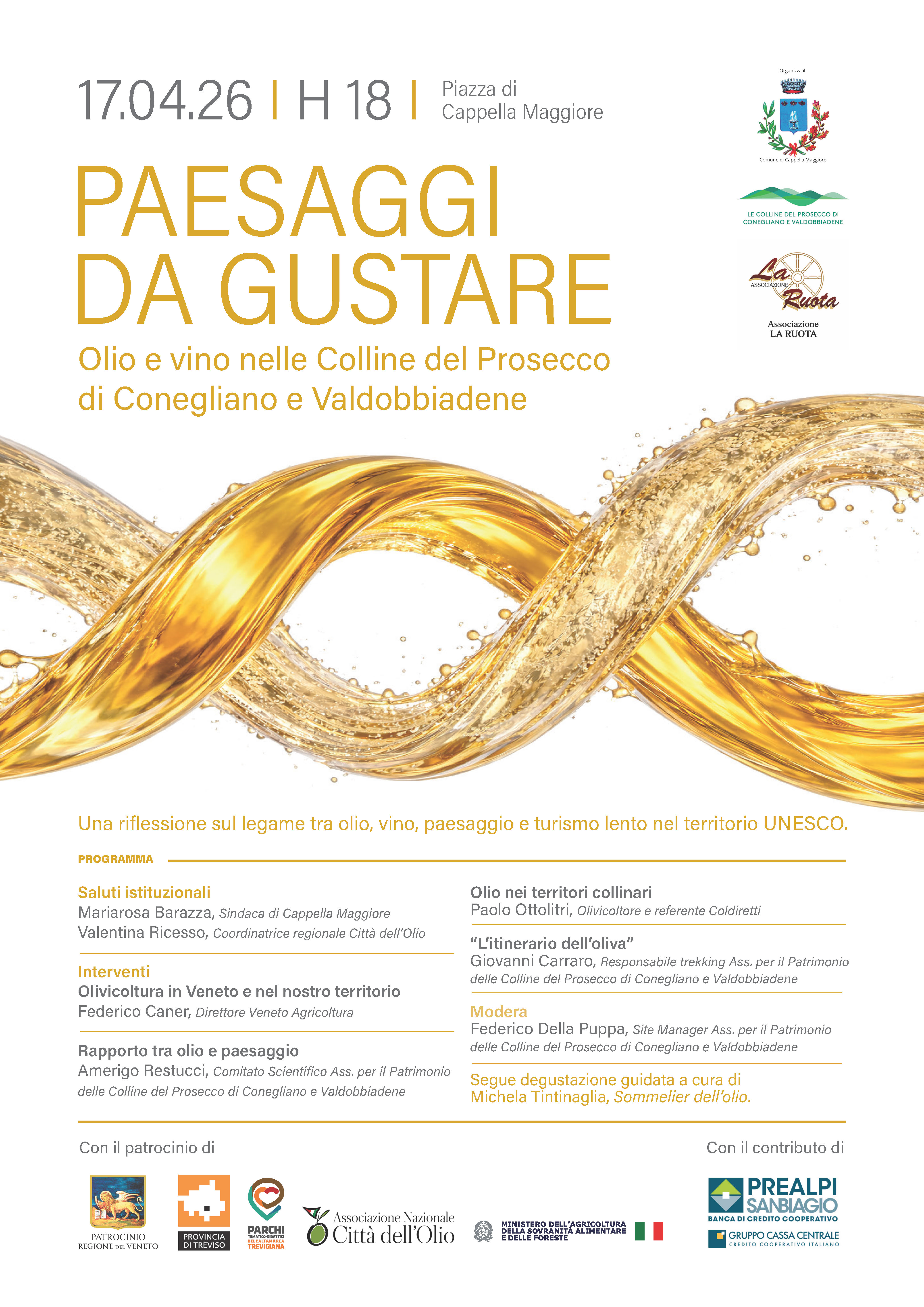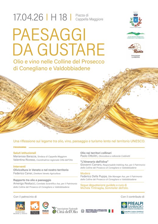 Venerdì prossimo sono stato chiamato tra i relatori in “Paesaggi da gustare” a Cappella Maggiore, uno dei comuni che tra i primi ha creduto nella valorizzazione degli itinerari nella commitment zone UNESCO, percorsi lontani dalla montagna ma ricchi di sorprese culturali come la splendida chiesa della Mattarella e gli stessi uliveti che in queste zone fanno presenza da secoli. Un incontro per parlare di olio e di paesaggio, sono curioso anch’io perché si parla sempre di vino e raramente di questo prodotto che accompagna da sempre l’uomo. C’è anche la degustazione con un sommelier dell’olio, venite!