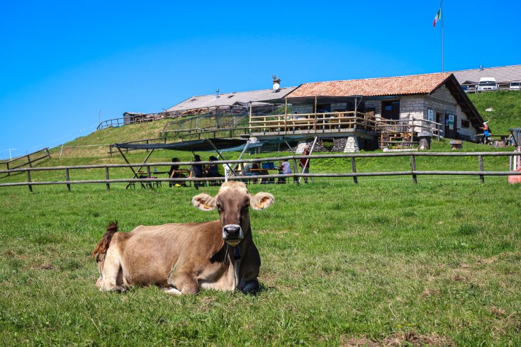 Oggi a Malga Mariech ho incontrato una Bruna Alpina sdraiata in bella vista proprio davanti all’ingresso, come se stesse dando il benvenuto. Alle sue spalle il brusio dei turisti a pranzo e le risate dei bambini nel piccolo parco giochi… ma lei, tranquilla e pacioccona, sembrava più interessata a scacciare le mosche che a badare a noi turisti. Una scena che fa pensare a quelle case dove, entrando, ti viene incontro il cagnolino di famiglia… solo che qui, in malga, tutto è in formato gigante e al posto del barboncino ti accoglie una dolce signora di mezza tonnellata!