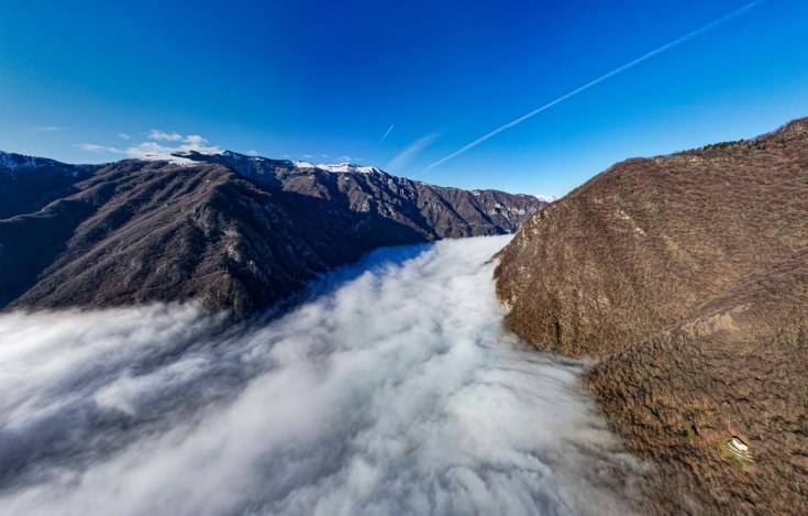 In queste giornate di alta pressione compare un fenomeno spettacolare che nel Canal del Piave chiamano “Berta”. La nebbia occupa la Valbelluna e il Feltrino e scende lenta e compatta lungo la valle come un enorme torrente di panna montata. Sotto fa freddo, è umido e buio, ma appena sopra il sole riscalda i pendii e le casere. La Berta avanza senza far rumore, tocca Marziai, Sanzan, Caorera, Carpen, Scalon per poi svanire tra Quero e Vas. Effimera e sfuggente, bisogna cogliere l’attimo prima che tolga il disturbo.