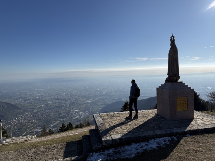 L’anello del Monte Caina, allo sbocco del Canale del Brenta poco a nord di Bassano, è uno di quei percorsi che restano dentro. Il sentiero sale da Campese a tornantini regolari lungo il segnavia 763 e quasi senza accorgersene si compie un salto di quasi 900 metri. Un passaggio su una bella cengia conduce al panorama in cima al Caina a quota 1002 m. Il ritorno passa dalla Bocchetta Campesana, chiudendo un anello molto frequentato sia dagli escursionisti sia dai pellegrini che arrivano da Rubbio, perché la Madonna del Caina è un simbolo da queste parti. Tornarci è stato un modo per guardare le mie montagne, dal Cansiglio fin qui, nell’angolo sud-est dell’Altopiano dei Sette Comuni e salutare un anno di belle camminate.