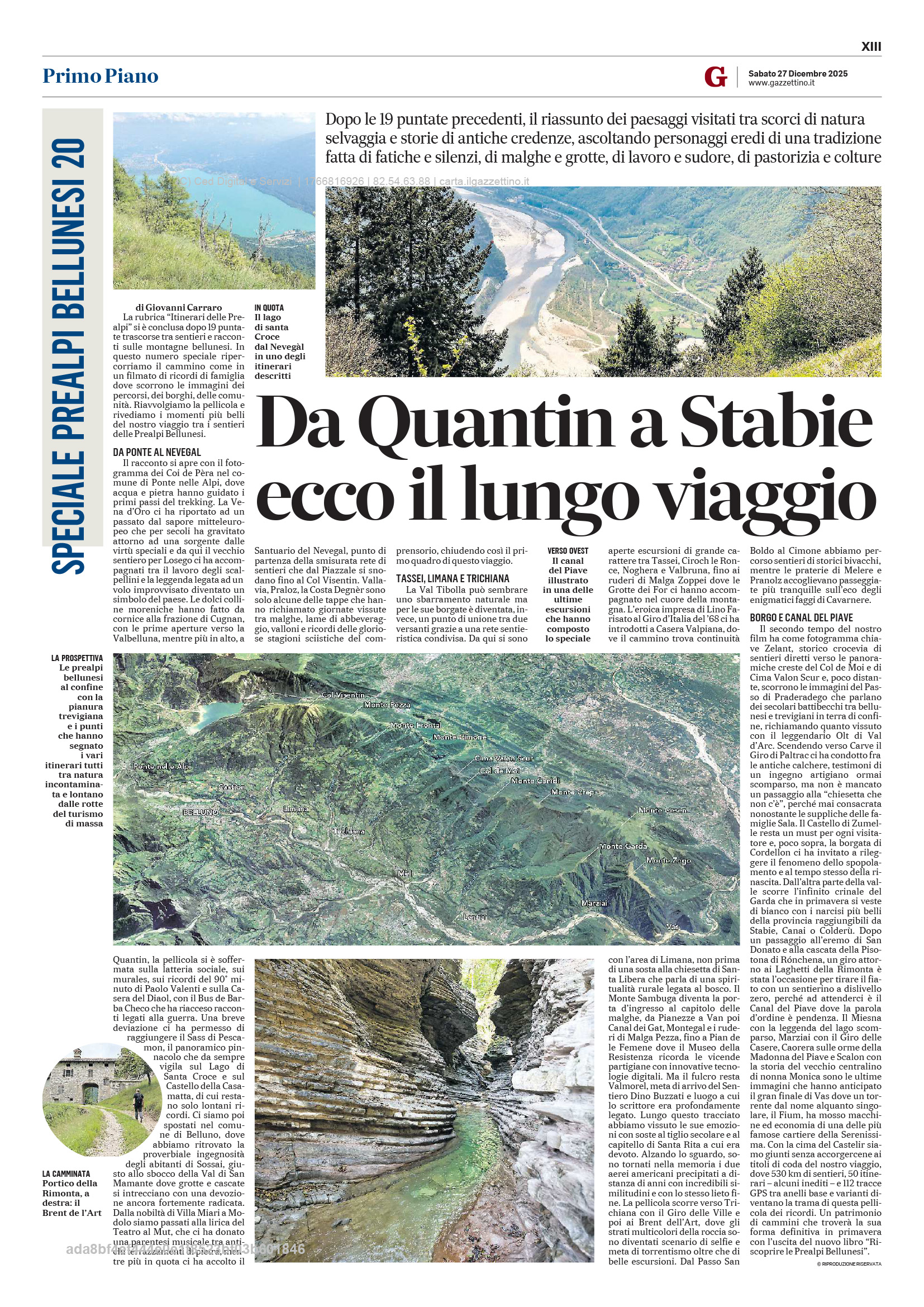 Sono uscito a sorpresa stamattina con questa pagina che avevo in mente da tempo, dopo aver concluso la rubrica sui sentieri delle Prealpi Bellunesi. Sentivo che mancava qualcosa, una sorta di "the best of" che ho paragonato a una pellicola dei ricordi di famiglia, quelle che si guardavano con il proiettore. Ho voluto scrivere per voi questa ventesima puntata speciale del Gazzettino di Belluno, cercando di condensare le emozioni vissute in due anni di cammino tra sentieri, borghi e persone, da Ponte nelle Alpi a Vas. Tirando le somme, sono stati mappati e raccontati 50 itinerari a piedi e 62 varianti, per un totale di 112 tracce GPS, pari a 530,9 km. Tutto questo è stato possibile grazie alla collaborazione di 135 persone che hanno creduto in me. E grazie a voi che mi seguite e mi accompagnate anche sui social. Nelle prossime settimane mi occuperò dell’assemblaggio finale del libro, che uscirà in primavera. Ci ritroveremo quindi con “Riscoprire le Prealpi Bellunesi”, vi terrò aggiornati.
